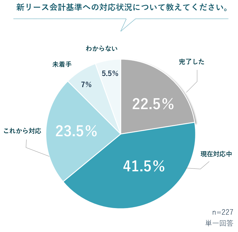 新リース会計基準への対応状況に関する調査(対象:新基準の対象企業に勤務し、対応に関与している227名)によると、72%が「現在対応中」「これから対応」「未着手」と回答しており、多くの企業が対応の途上にあります。