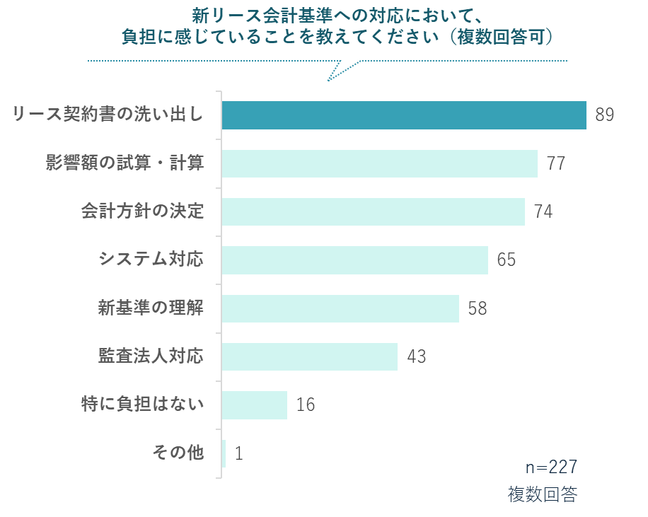 さらに、対応に向けて多くの担当者が負担に感じていることとして、「リース契約書の洗い出し・分類・整理」を挙げています。これは、契約書タイトルに「リース」と記載のない建物賃貸借契約やサービス契約などにも、新基準の適用対象となる可能性がある「隠れリース」が潜んでおり、膨大な契約書を目視で確認しなければならないという実務の壁があるためです。