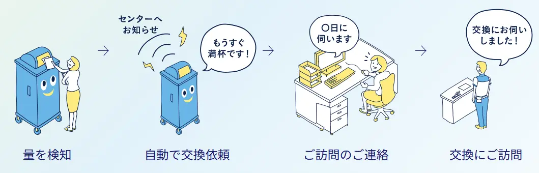 自動で中身の投函量を検知し、担当者様の代わりに自動で交換依頼をする、シュレッダーに代わる機密文書回収ボックスとなります。シュレッダーと異なり、クリップ、ホチキス、金属ファイルの分別が不要で、Smart保護くんに機密文書を投げるだけで処理が完了します。