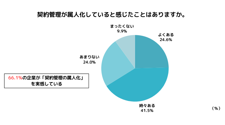 契約書のデジタル化は進む一方で、実務現場では依然としてアナログな対応が残っているのが実情です。こうした中、当社が2025年12月29日・30日に、25~59歳の管理部門業務(財務・会計・経理・総務・設備管理・法務)担当者342名を対象に実施した調査では、66.1%の企業が「契約管理が属人化している」と実感していることが明らかになりました。