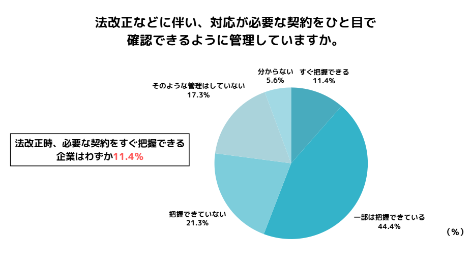 さらに、法改正に伴うリスク管理の実態をみると、「対応が必要な契約をすぐに把握できる」と回答した企業はわずか11.4%に留まりました。多くの企業において、法改正の影響調査やリスク分析は膨大な資料の目視確認に頼らざるを得ず、締結済みの契約書が「保管」されるだけで、過去の知見が全社的なナレッジ(資産)として活用されない「情報の断絶」が深刻な課題となっています。