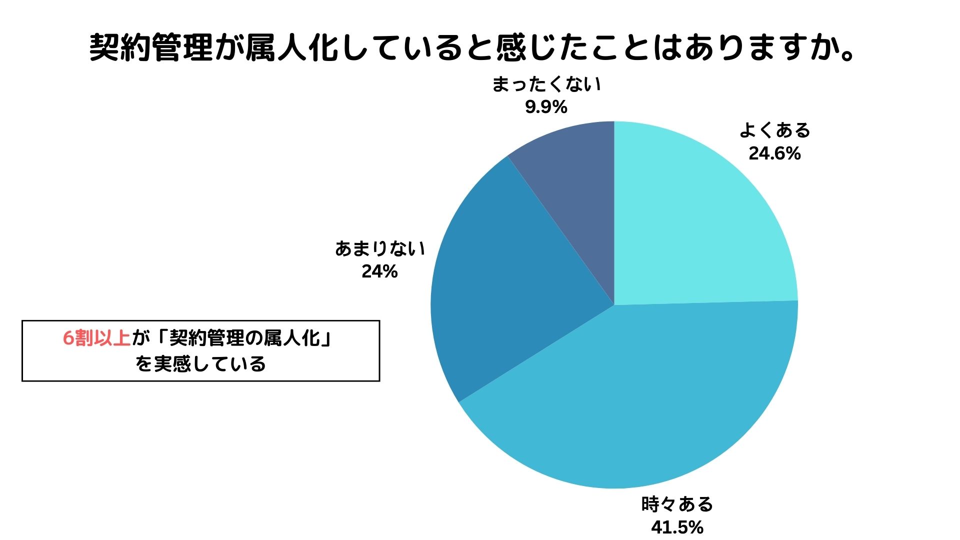 契約更新漏れを「経験したことがある」と回答した人は43.9%(3人に1人以上)にのぼり、さらに契約管理の属人化について「よくある(24.6%)」「時々ある(41.5%)」と感じている人は合計66.1%となりました。