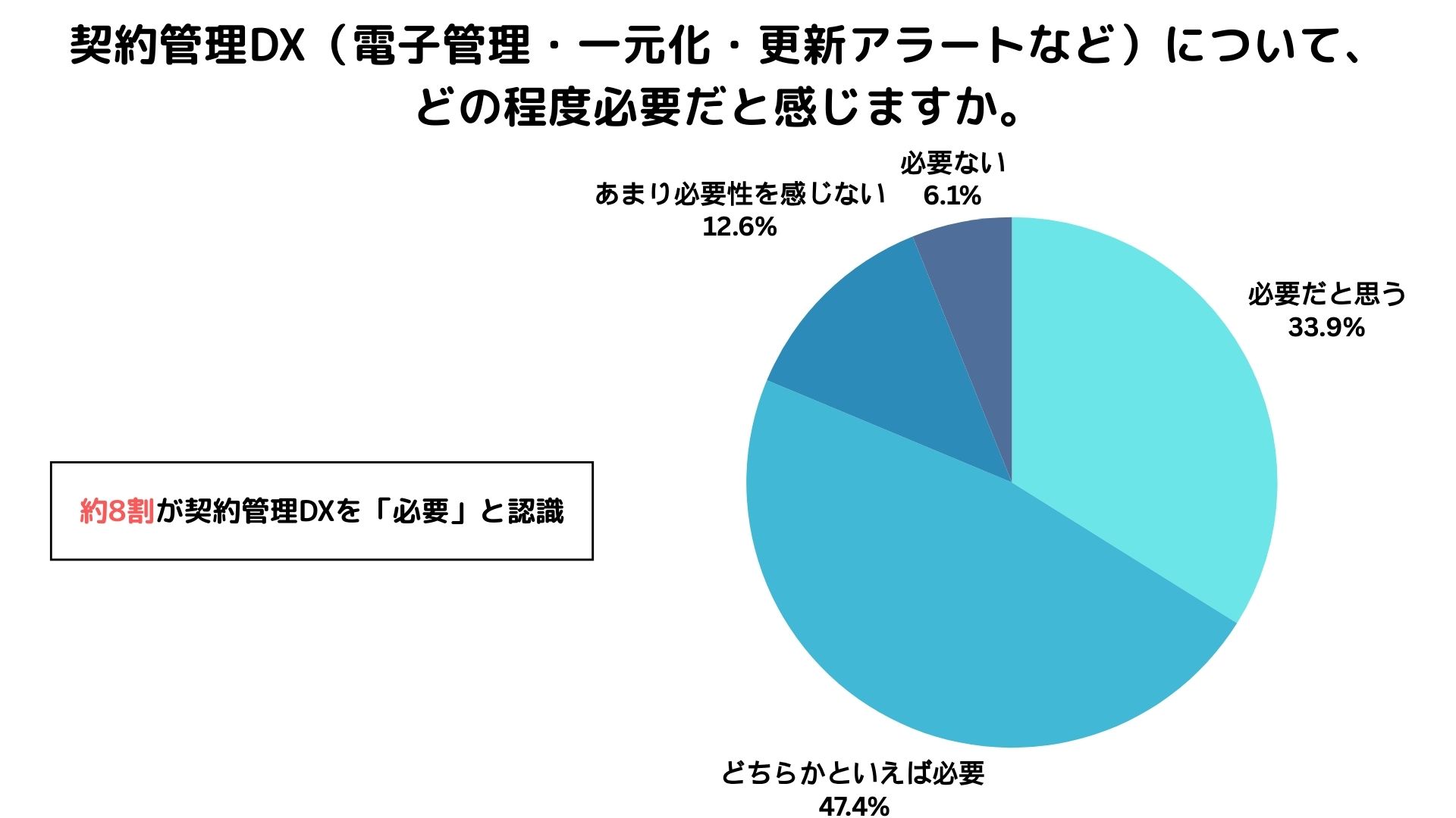 契約管理DXについて「必要だと思う(33.9%)」「どちらかといえば必要(47.4%)」と回答した人は81.3%にのぼり、契約管理におけるデジタル化の必要性は、すでに多くの企業で共通認識となっていることが明らかになりました。