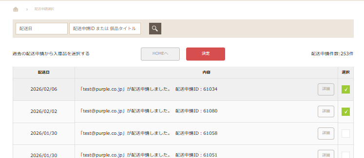 2.過去の配送申請一覧が表示されるので、「詳細」で内容を確認